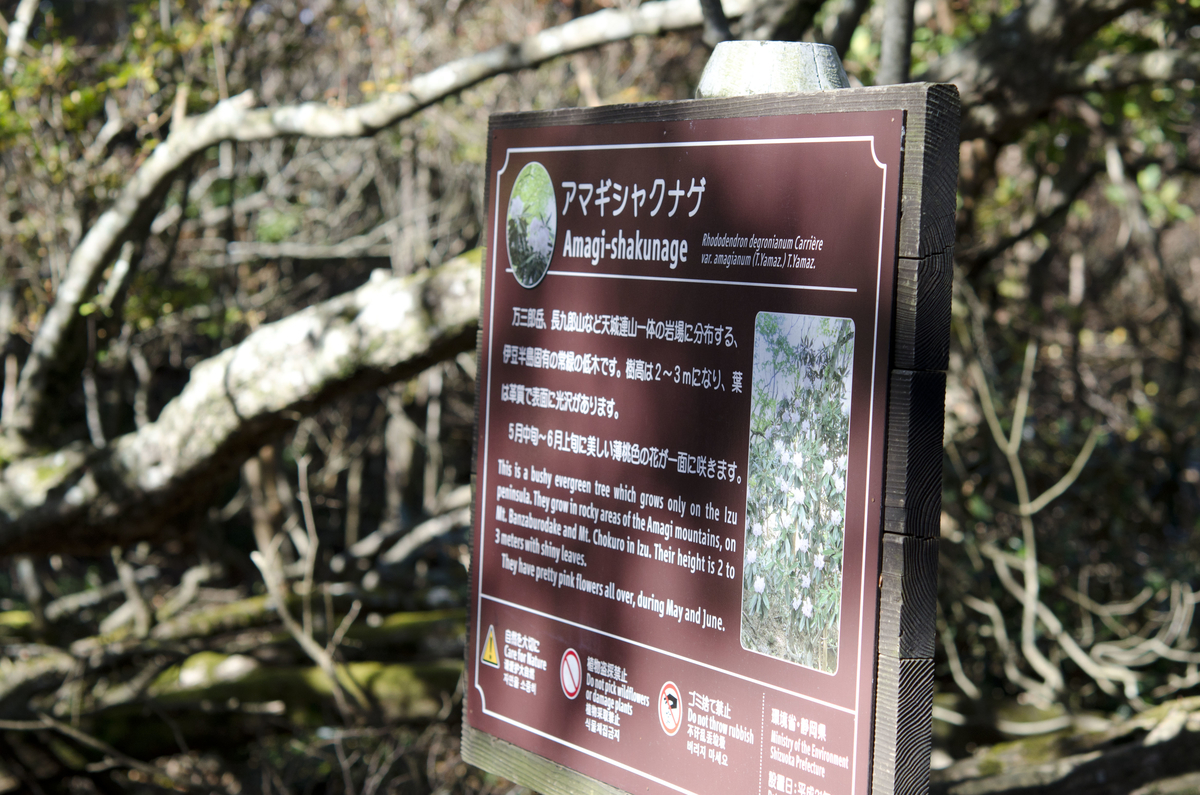 天城峠近辺の植生はサワラChamaecyparis pisifera・スギCryptomeria japonica・ヒノキChamaecyparis obtusaの植林にモミAbies firma・ツガTsuga sieboldii・イヌガヤCephalotaxus harringtonia・イロハモミジAcer palmatum・ハウチワカエデAcer japonicumやウラジロガシQuercus salicinia、アカガシQuercus acuta、ヤブニッケイCinnamomum daphnoidesが混じったもの。天城峠に登るとコハウチワカエデAcer sieboldianumの巨木が迎えてくれます。