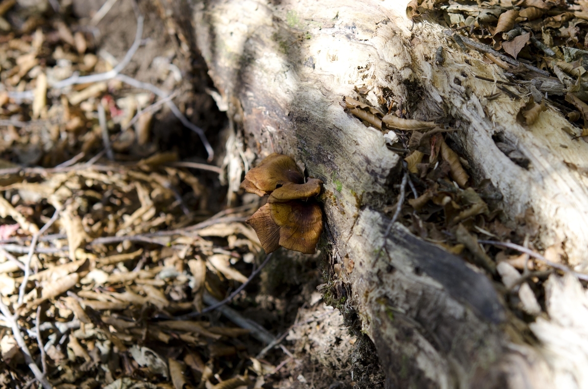 原生林はこんな感じ。ブナシメジHypsizigus marmoreusも生えていました。