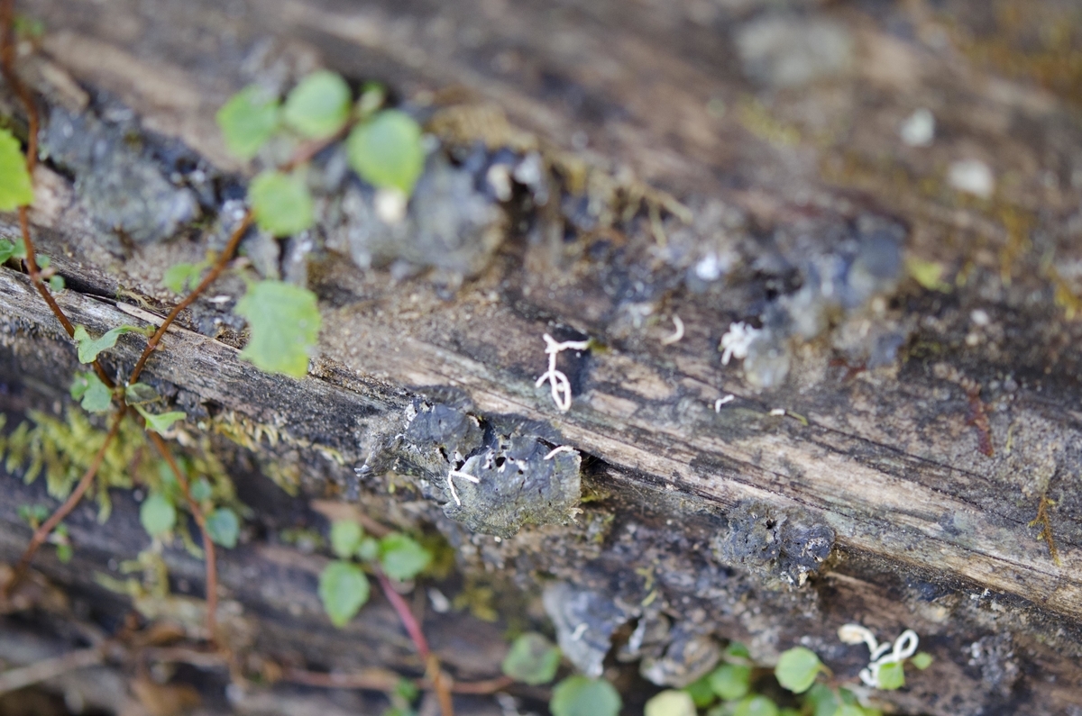 しばらく天気が続いていたので変形菌を見かけないと思っていたら、アカコブタケの隣に発見しました。漫画『蟲師』に出てきそうな物体ですが、ハイイロフクロホコリPhysarum bivalveです。ここだけは朽木が沢の流れの近くで湿っていたからでしょう。
