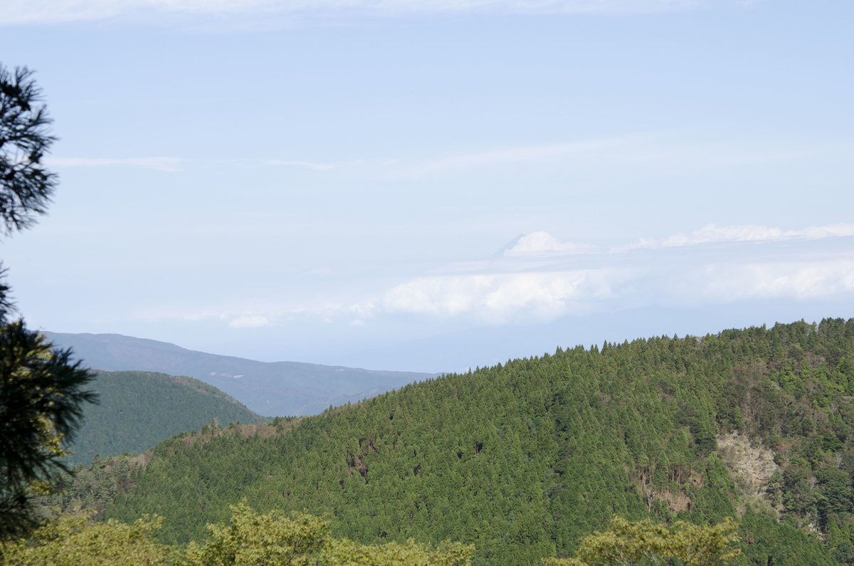 帰りの戸塚歩道を歩いていると、台風の影響でスギの葉が辺り一面を覆い、何が何だか分からなくなったので道をロストしました。尾根や谷があれば地形から現在地は分かりやすくなるのですが、登り尾でもそうだったように平らな場所では方位と何分歩いたかだけが頼りになるため、道を見失いがちです。仕方がないので北に直行するとどう考えても天城林道にしか思えない場所にぶつかりました。葉に埋もれた戸塚歩道よりは大分回り道になりますが、仕方がないのでここを通ることにしました。林道からは富士山がよく見えました。