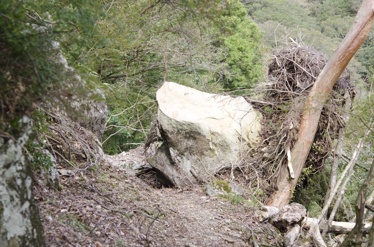 三蓋山に向かう途中、年配のご夫婦が前から来られて崩落地をトラバースされたとのことでした。本当は崩落地まで行って引き返すつもりだったのですが、年配のご夫婦がトラバースされて私がしない訳にはいかないので、崩落地で手を使って60°ほどの斜面を直登し、ピークまで上がってから適当な尾根を下ることにしました。写真はトラバース成功後に振り返って撮った写真。数十mにわたって道が跡形もなく崩れ落ちています。トラバース中は危険なのでカメラはしまっていたため、写真はありません。下りは以前の綾に行った時の方が危険でしたが、登りは確かに少し苦労しました。