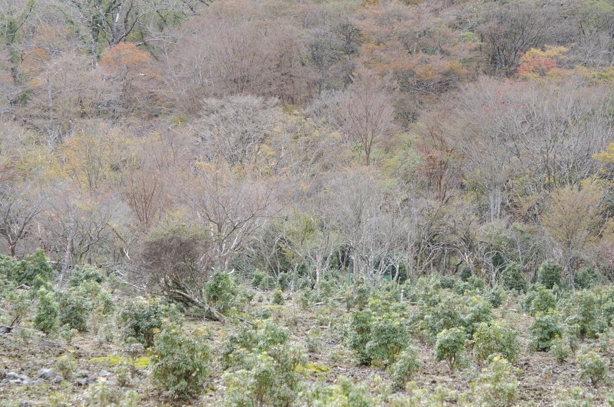 アカシデCarpinus laxiflora・イヌシデCarpinus tschonoskiiの群落を抜けて暫くすると旧天城峠に到着。由緒ある場所ですが、後ろに赤い木肌のヒメシャラStewartia monadelphaが結構生えているのが分かると思います。