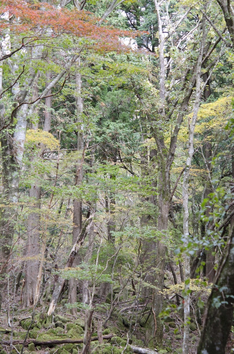 上井屋歩道入口からは道なのかどうかよく分からない60°ほどの斜面を登っていきます。火口近辺につくと北側はスギCriptomeria japonicaやヒノキChamaecyparis obtusa、サワラChamaecyparis pisiferaの植林ですが―